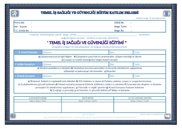 Eklenmiş Dosyalar Dosyaları indirebilmek için oturum. Eğitime Katılım ile ilgili form. Talimat Ve Tutanağı. Kişisel Koruyucu Zimmet Tutanağı. Kurul İç Yönergesi. IGiçin tek bir yazılı sınav yapılacaktır. IGiçin ise yazılı sınav yapılmayıp katılımcının hazırlayacağı ödev yeterli olacaktır. Türkçe dilinde yapılan eğitim için katılım için bir şart yoktur. SG KURUL İŞLEMLERİ. ORTAK SAĞLIK GÜVENLİK BİRİMİ-OSGB Ceyhun Atıf Kansu.